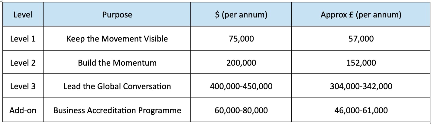 Bank.Green is seeking catalytic funding to expand its reach, strengthen its digital infrastructure and accelerate the global shift toward climate-aligned banking. Each level represents a stage of growth — from maintaining visibility and trust to building a professional communications engine capable of influencing public and corporate behaviour at scale.